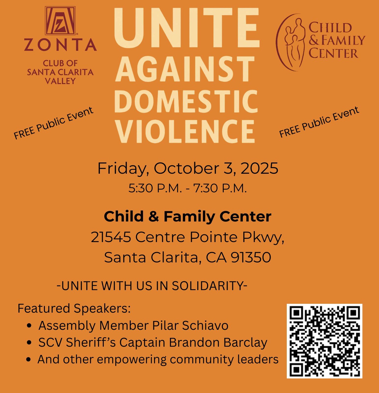 The Zonta Club of Santa Clarita Valley, in partnership with the Child and Family Center, invites the community to join UNITE Against Domestic Violence, a powerful community event on Friday, Oct. 3.